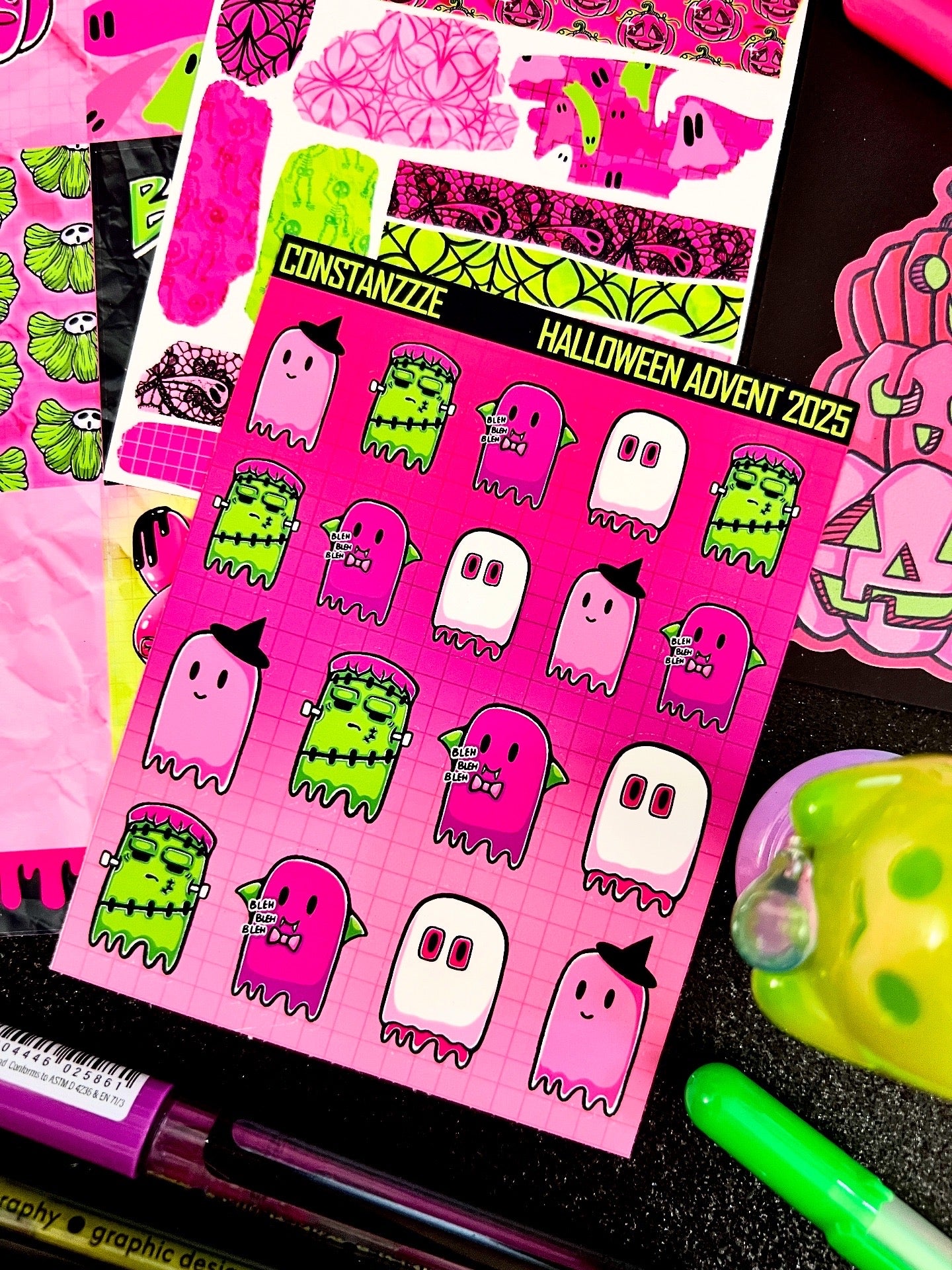 This listing is for either all sheets shown or individual sheets from Day 8 of my 2025 Halloween Advent! All art is hand drawn by me with love :)